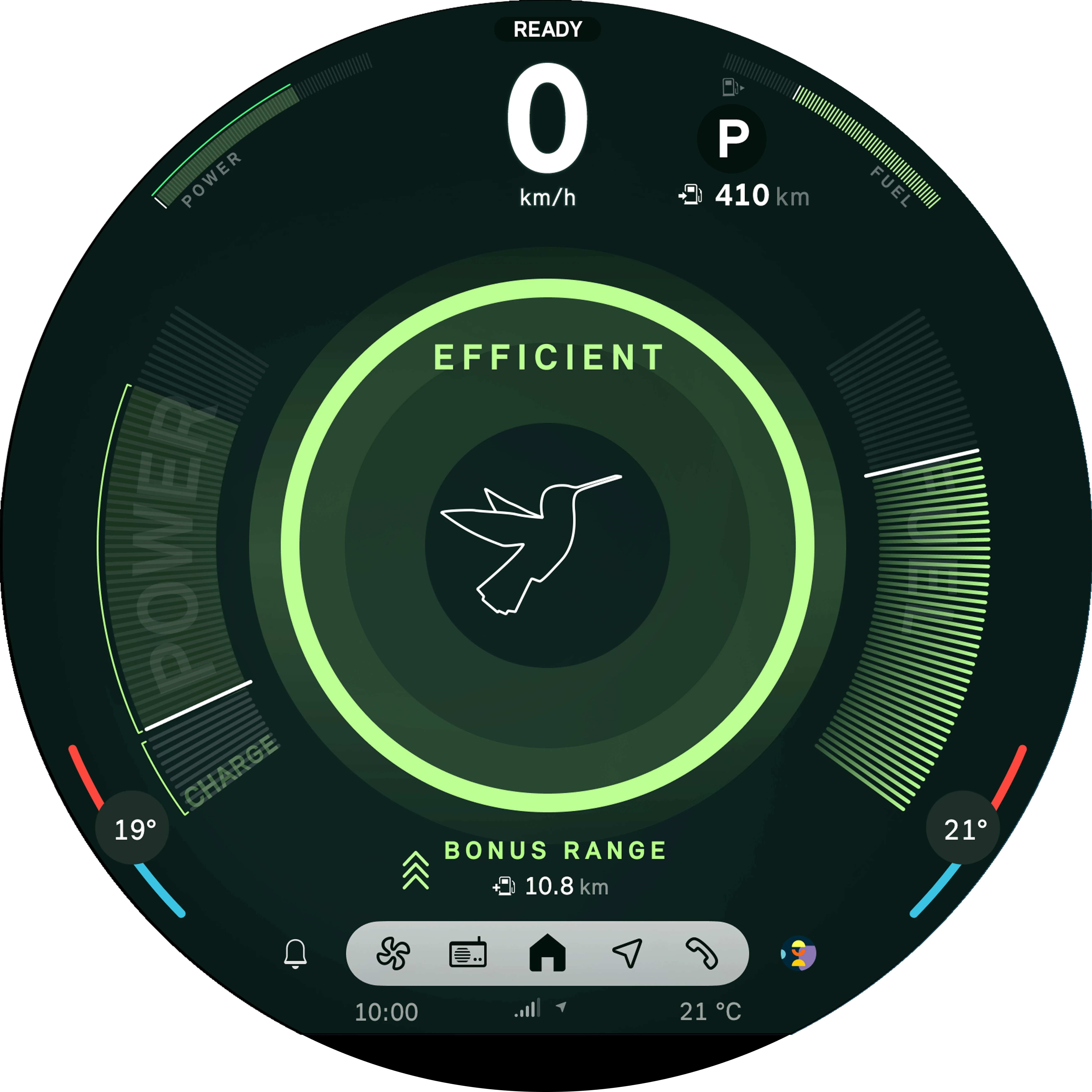 The Efficient Mode supports a driving style that reduces consumption and emissions. For this purpose, comfort functions such as the air conditioning performance and the engine control are adjusted. In the user interface you see the achieved increase in reach as bonus reach.